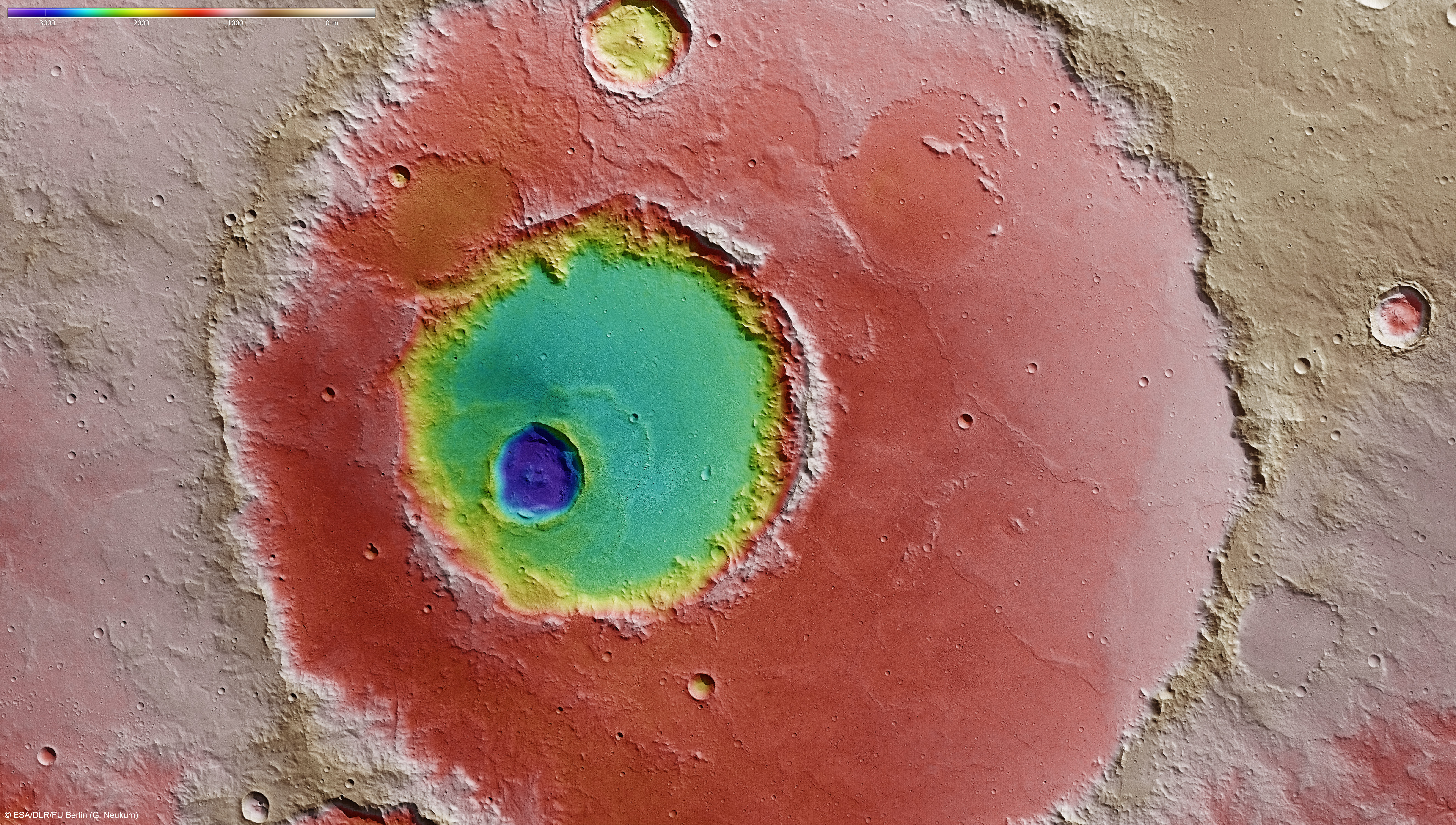 Gleich mehrmals wurde der Hadley-Krater auf dem Mars im Laufe seiner Geschichte von großen Asteroiden getroffen. Die so entstandenen Krater im Krater ermöglichen einen über zwei Kilometer tiefen Einblick in die Marskruste. Das zeigen die von der hochauflösenden Stereokamera HRSC am 09. April 2012 aufgenommenen Bilder. Die HRSC-Kamera wird vom Deutschen Zentrum für Luft- und Raumfahrt (DLR) betrieben und befindet sich an Bord der ESA-Raumsonde Mars Express.